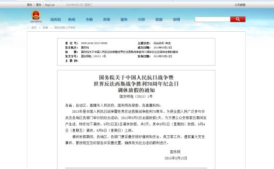 9月3日放假1天原標題:國務(wù)院關(guān)于中國人民抗日戰(zhàn)爭暨世界反法西斯戰(zhàn)爭勝利70周年紀念日調(diào)休放假的通知